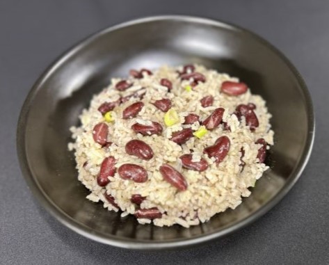 Riz créole épicé, haricot rouge et cives mijotés dans le lait de coco